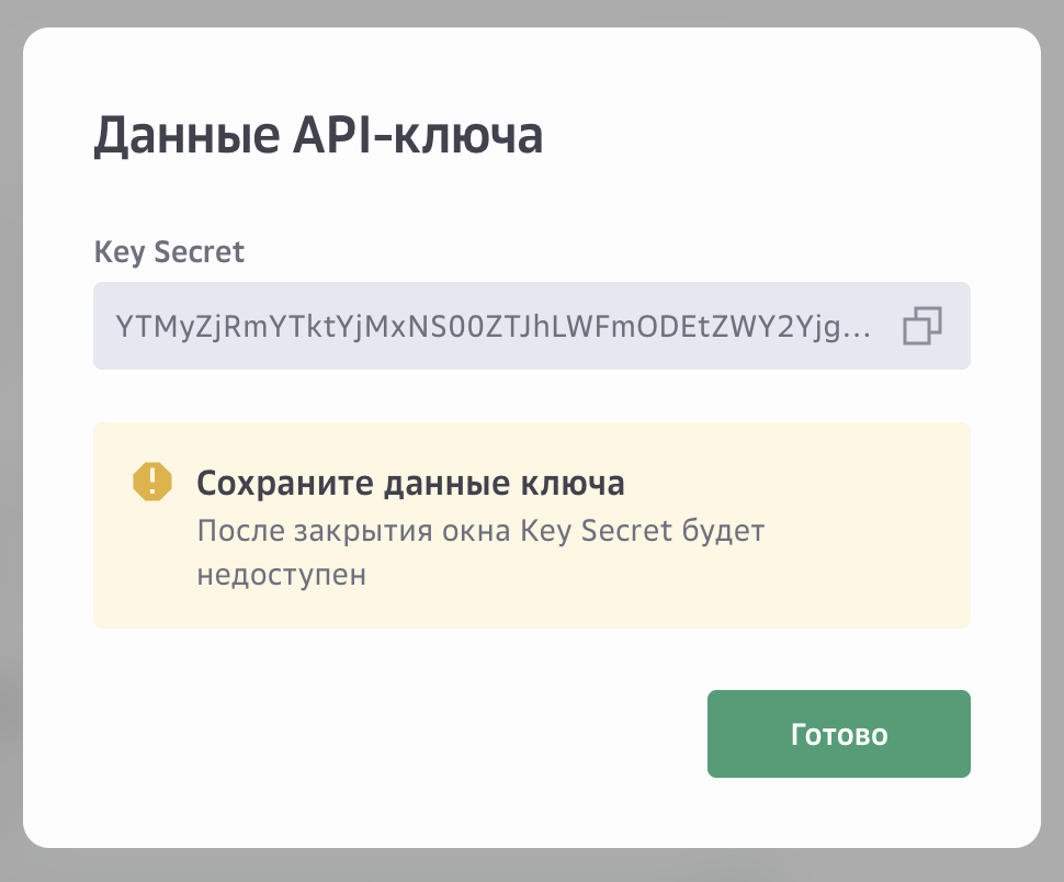 Копируем данные API ключа. Они больше не появяться.